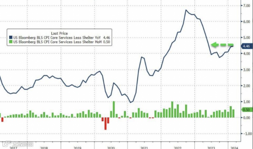 所谓的超级核心通胀,也即剔除了住房的核心CPI服务指数环比上涨 0.5%,同比增幅高达4.5%,创2023年5月以来的最大增长。