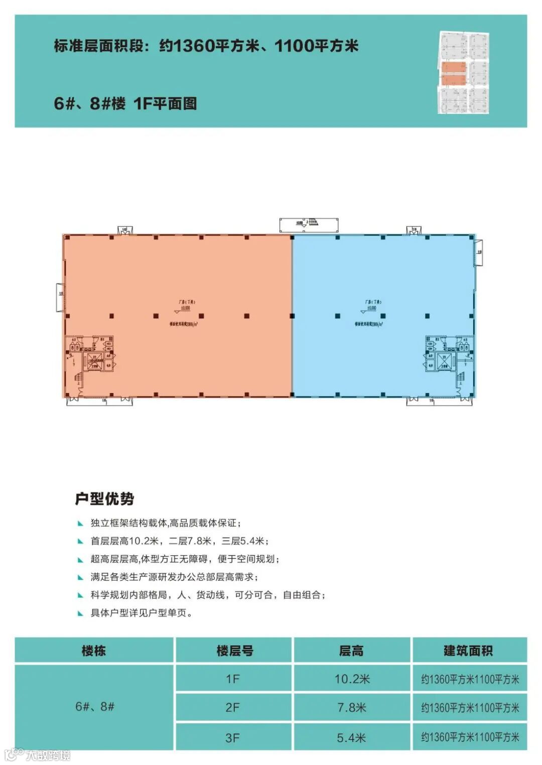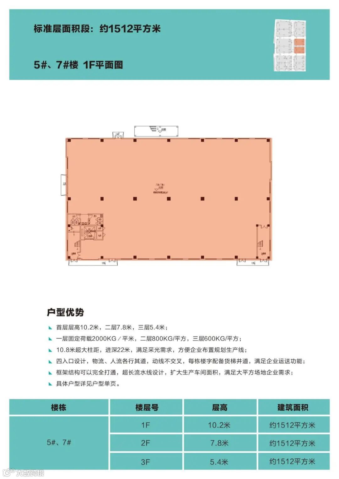 3层厂房,单层面积1000-2300平,超宽柱距15米,1楼层高10.2米,可架10吨行车;2楼层高7.8米,荷载1.2吨/平