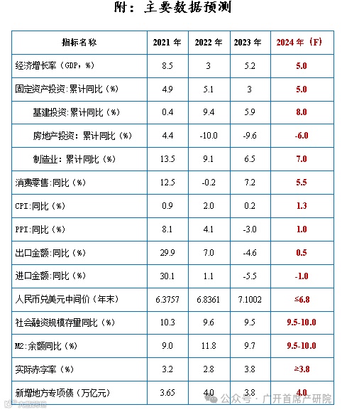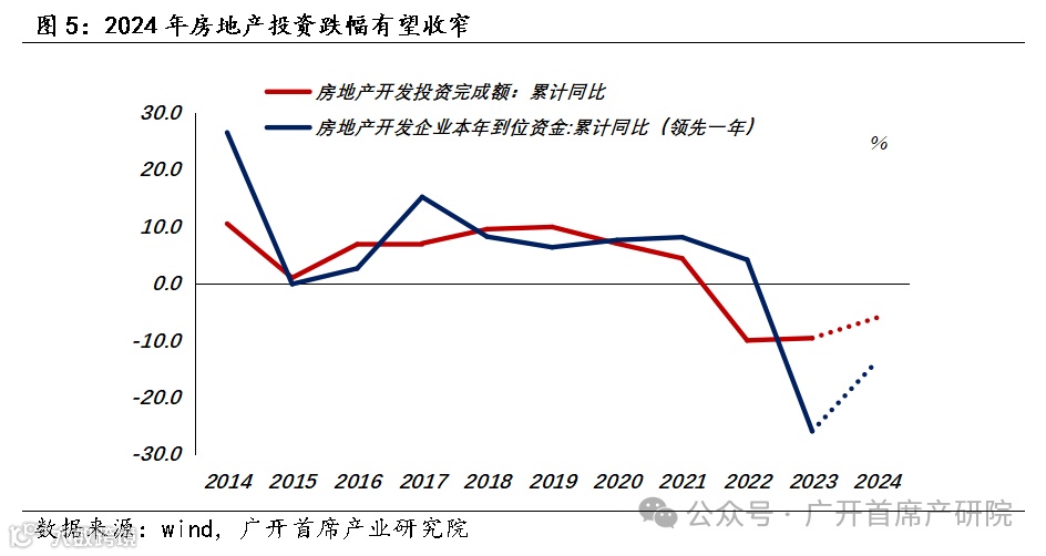 【展望五:房地产市场逐渐企稳】2024年,房地产政策将继续保持支持态度,促进居民购房需求逐步释放,满足包括民营房企在内的合理融资需求,推进“三大工程”建设助力房地产投资逐步企稳。预计房地产销售、房价及投资等关键指标可能先抑后扬,全年住房销售面积下跌5%,新房价格持稳,投资同比下跌6%,跌幅较2023年收窄。
