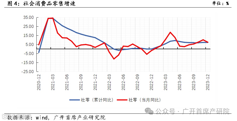房地产企稳,带动相关消费回暖。2023年,尽管大部分商品销售状况出现改善,但房地产相关商品销售(装修建材、家具和家电等)的表现不尽如人意。根据测算,房地产投资波动1个点,将影响消费2至3个点。若在相关政策的推动下,房地产企稳回升将对消费产生利好。