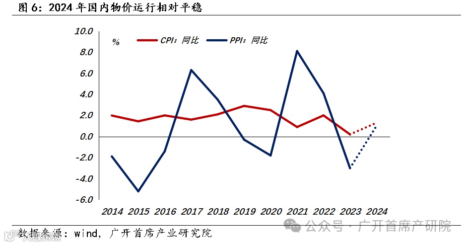 【展望七:物价回暖同时经济增长含金量提升】2024年我国GDP增速有望达到5%左右。在扩张性宏观政策的积极推动下,“三驾马车”不同程度地协同推动经济增长,最终消费和资本形成分别拉动GDP3.6和1.4个百分点,净出口对GDP的贡献相对中性。受基数效应影响,一季度和三季度的增速可能快于二季度和四季度,全年呈现“倒N”型走势。预计2024年CPI同比上涨1.3%,食品价格止跌企稳及服务业价格走升是主要推力;PPI同比增速可能达到1%,国际油价中枢抬高、国内投资恢复有助于工业品物价由跌转升。
