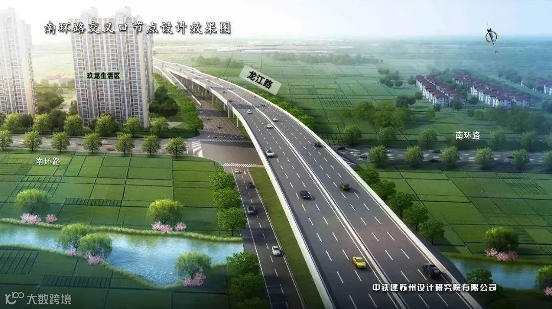龙江路快速化工程北起南环路,向南延伸至太浏快速路,总长10.1公里,全线采用“上六下四”车道断面,主线高架段落9.5公里,为双向六车道,设计速度为80公里每小时;地面道路为双向四车道,采用城市主干路兼二级公路标准,设计速度为50公里每小时。其中,一期工程北起协鑫路、南至新塘河,路线全长约2.74公里。