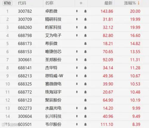 或是受到上述消息催化,今日消费电子产业链多股走高,其中卓胜微、精研科技、昀冢科技20CM涨停,水晶光电涨停,艾为电子、圣邦股份、杰华特、唯捷创芯、思特威、韦尔股份等大幅走高。