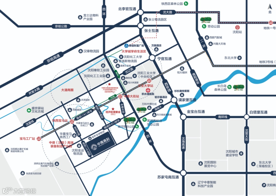 沈阳中德智造谷位于沈阳经济技术开发区中德大街40号,交通便利,周边公路、港口、机场、货运站等生活设施一应俱全,为您的工作和生活提供便利。