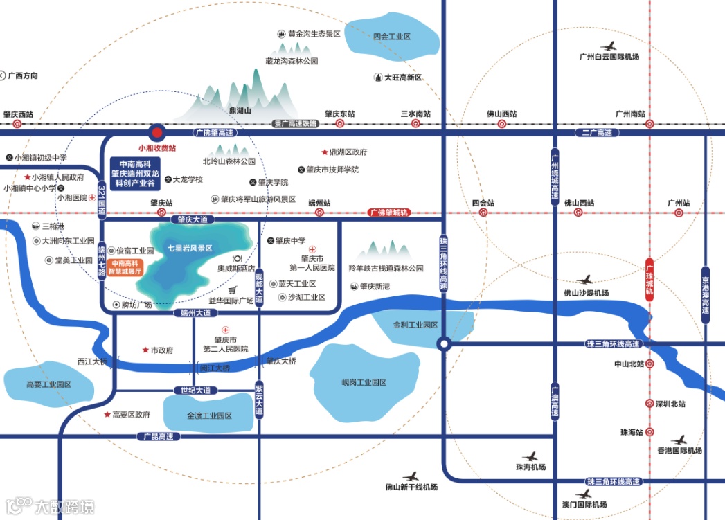 中南高科·肇庆端州双龙科创产业谷距离肇明高速入口约5.66公里,距离肇明高速出口约5.67公里,距离广佛肇高速出口约1.10公里,距离广佛肇高速入口约1.40公里。此外,园区距离肇庆市区和肇庆其他重要地区也非常便利,交通十分便捷。