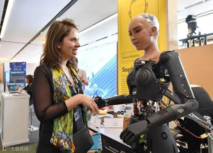 2023年7月7日,在瑞士日内瓦“人工智能造福人类全球峰会”上,一名参会者与仿真机器人索菲亚互动。新华社记者 连漪 摄