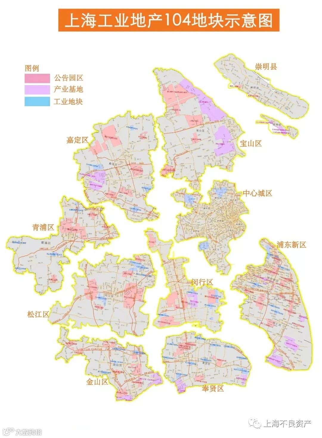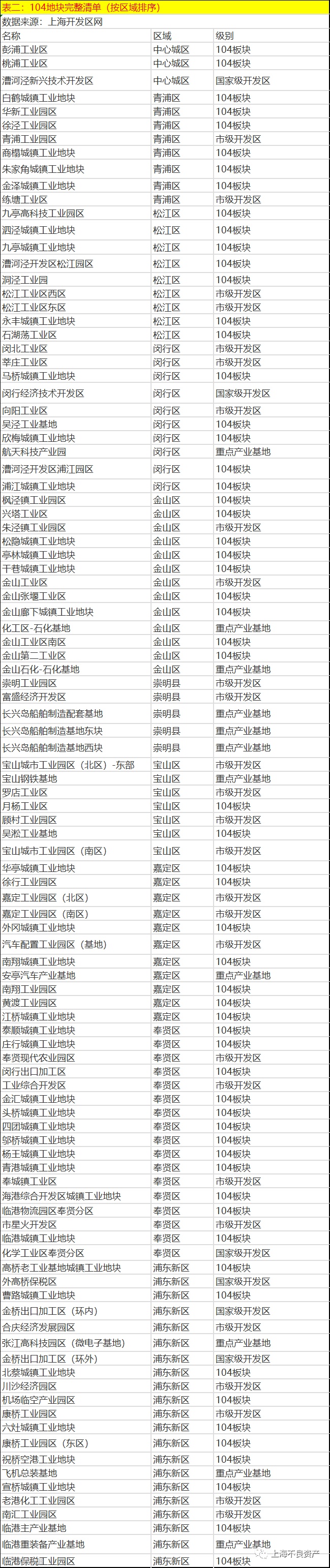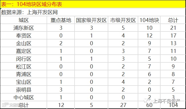 地块包括重点基地12个,国家级开发区5个,市级开发区27个,以及新规划的60个园区。104个工业园区分布在上海各区域。