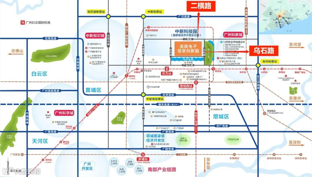 中南高科·增城产投·高端电子信息创新园,作为中新科技园内唯一四面临路产业园,借助二横路、乌石路,实现与黄埔中新知识城、朱村科教城、增城开发区的交通道路互联互通、产业联动发展,为园区企业发展带来全新的契机,有效带动产业升级。