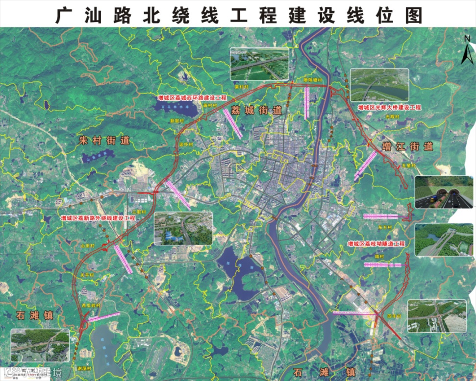 作为增城重点规划建设项目,广汕路北绕线全长27公里,连接荔湖、朱村、荔城、增江、石滩等5个镇街,联通广惠、北三环、增天、广河、从莞深等5条高速公路,带动北部三镇。