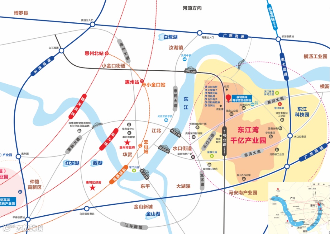 中南高科·惠州高端电子信息创新园距离惠大高速出口约5.04公里,距离惠大高速入口约5.08公里,距离广惠高速出口约5.59公里,距离广惠高速入口约5.64公里,距离惠龙高速出口约5.98公里,距离三环北路入口(惠大高速方向)约5.83公里。此外,园区距离惠州市区和惠州市其他重要地区也非常便利,交通十分便捷。