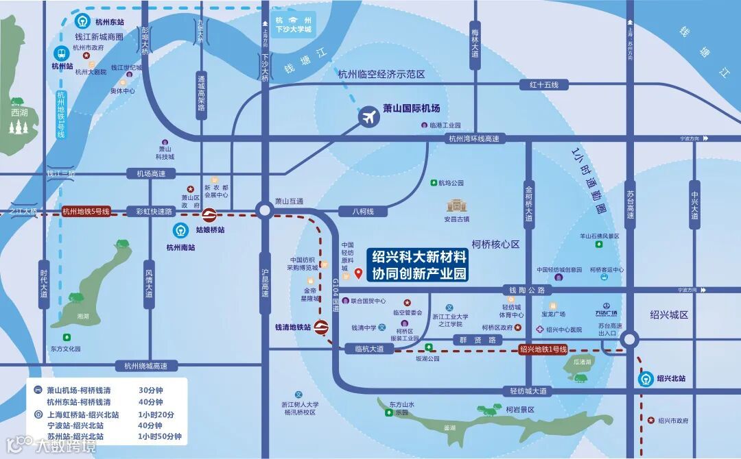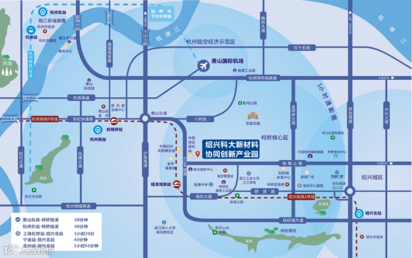 高速路网:苏台、杭金衢、绕城沪昆入口位置杨汛桥互通,柯桥互通,齐贤互通、杭州南互通、瓜沥互通等。