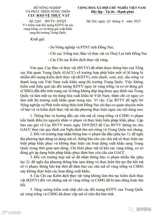 据越媒报道:数百个集装箱的香蕉、菠萝蜜、榴莲、火龙果……准备出口到中国,突然收到当局的正式通知,要求暂时停止出口。嘉莱某香蕉出口企业总经理Tien Phong表示,9月9日,该企业将2个集装箱香蕉、相当于约40吨香蕉运至胡志明市吉莱港,却收到暂时停止出口的通知。胡志明市第二区植物检疫局给出的理由是,该包装设施代码因违反植物保护规定而被暂停。商家们非常惊讶,因为他们不知道发生了什么。我们联系中国客户询问该产品是否曾被发现感染过昆虫或害虫,他们回答说从来没有,因为如果是有,中国海关就会退回货物或销毁它们。联系过二区植物检疫分局领导的企业也证实,他们的出货量一直都是有保证的。该部门尚未收到有关这批货物存在任何植物检疫问题的报告。“暂停只是应植保部门的要求才进行的,”该人士表示。不仅是嘉莱的企业,还有同奈省、多乐省、西宁省、平顺省、平福省、西宁省、前江省的许多企业出口香蕉、菠萝蜜、榴莲、火龙果、芒果……仍然愣住了,因为他在9月9日也收到了同样的通知。前江省一家榴莲出口企业负责人分享,9月9日上午,该企业将货物运至港口准备出口中国后,收到包装编码已暂停出口的信息。“我们非常惊讶,再次询问了前江省农业和农村发展部。农业和农村发展部也很惊讶,直到中午,他们才在植物保护部的指导下确认了这一信息的正确性,并于最近转发了正式的通知。”业务代表说。该人士还表示,连农业农村部都还很惊讶,更何况中方还没有宣布任何消息,植保部突然停止对农产品出口检疫,让企业措手不及。仅9月9日,就有数十家商家反映类似情况,近千吨香蕉、菠萝蜜、火龙果、榴莲等产品被暂停销售。当时我们很困惑,因为货物已经装进集装箱了。现在我们无法出口,农产品将会受损,而且损失将是巨大的” ——前江省一位企业负责人告诉我们。根据Tien Phong获得的消息,9月9日突然停止出口的原因是植物保护部向同奈省、嘉莱省、多乐省、西宁省、永隆、隆安省、平顺省、前江省、平富省、同塔省、茶荣省等11个农业和农村发展部发出的正式通知,由植物保护部副部长 Nguyen Thi Thu Huong 女士于 9月5日签署。据此通知内容宣布,植保部门收到中方警告称,越南部分批次香蕉、芒果、菠萝蜜、榴莲和火龙果受到植物检疫物污染。因此,本单位建议职能单位对名单上种植区代码和企业代码所属的出口货物不办理植物检疫手续。在这份名单中,有74个种植区号、包装设施首次报告违规并要求暂时停止出口;有 47 个代码建议撤销。这些大多是越南大型农产品出口企业,如:Công ty CP Thương mại Xuất nhập khẩu Dũng Thái Sơn、Công ty TNHH Huy Long An、Công ty TNHH Thương mại Quốc tế Sofia Việt Nam、Công ty Xuất nhập khẩu Vking......值得一提的是,官方通报并未具体说明禁令或召回何时开始以及持续多久,导致运往港口的数十个集装箱农产品商家被延误。“我们也质疑,为什么如果出现违规情况,海关没有提前发出警告,让商家审查,或者提前通知一段时间,让商家做好准备。货物到达口岸,商家才发现。” “该企业的一集装箱香蕉价值近30亿越南盾。更何况,即将进入主产季的一批水果会怎样?这就像堵塞了企业的生存方式”,同奈省的一家香蕉企业愤怒道。农业和农村发展部植物保护副司 Nguyen Thi Thu Huong 女士于 9 月 10 日在接受记者采访时表示,该部门定期每隔3个月对违反种植区代码和贡献企业的情况进行通报。根据规定,各国植保组织将相互通报植保领域的违法行为。该部门建议暂时停止出口的原因是审查违规原因并采取纠正措施。针对该部门的通知如此之快以至于企业无法跟上这一事实,Huong女士表示:“该机构向企业发出的通知将取决于每个国家。对于拟召回的企业,这并不是商务部第一次通知他们。对于首次办理的业务,农业农村部及其分支机构已发函,这些单位有处理经验。”当被问及为什么商务部不提前发出警告,以便企业有时间审查和准备,一旦发现违规情况,直接要求停止出口时,Huong女士说:“这避免了影响越南农产品声誉的情况。在得到反馈后,该局立即开始为企业提供支持,并让所有的货物都可以正常出口。”据PV Tien Phong最新消息,意识到企业界对突然停止出口的反馈,农业和农村发展部部长黎明焕已指示并要求植保部门立即处理,以便发货能够顺利进行。办理正常的出口手续。新闻来源:vtc.vn