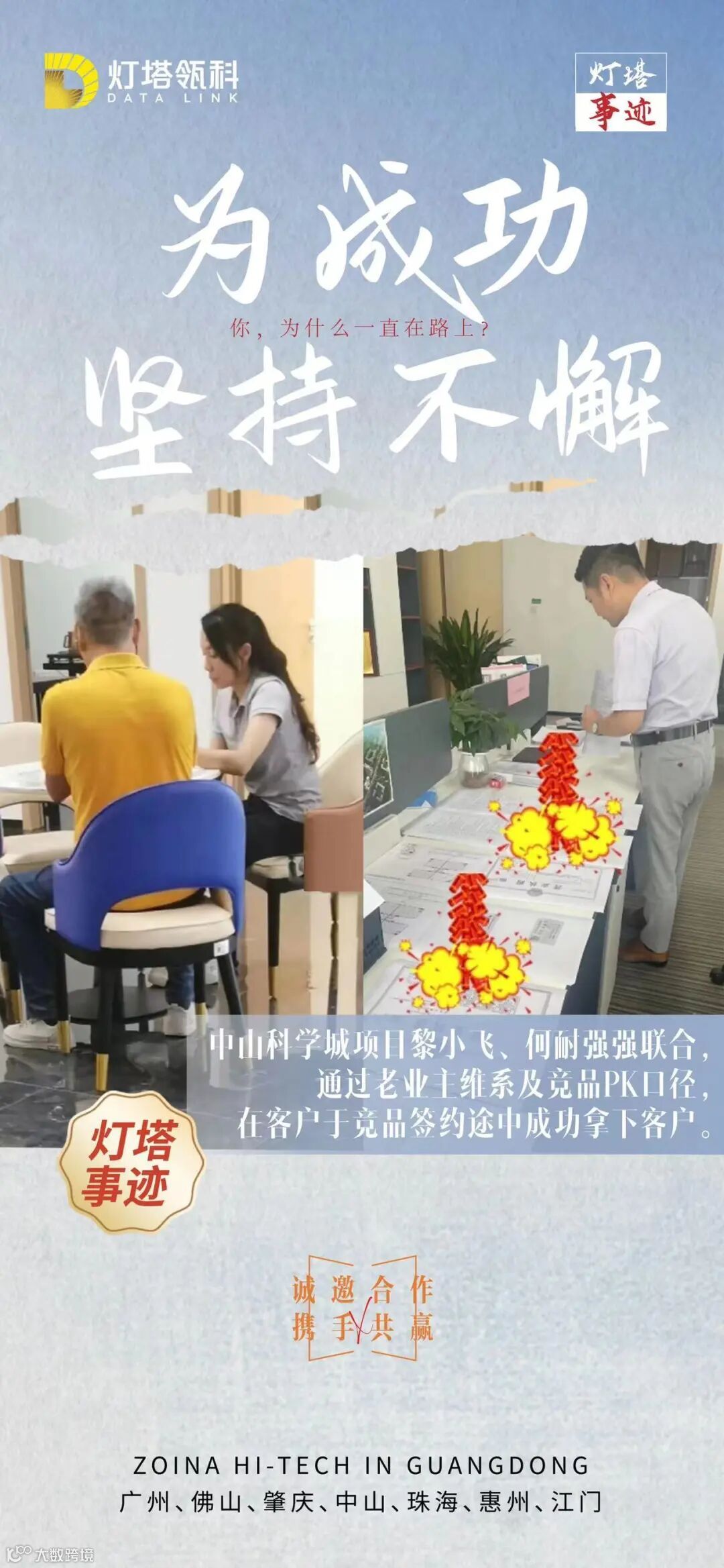 广东战区珠海斗门项目李霞,不辞辛苦,不畏艰难,通过拓展预招商前用政府批文、规划等维系客户,甚至下雨天依然直奔工地现场与客户视频拍摄项目工程进度,最终用真诚打动客户,用项目进度打消客户顾虑,最终成功签约取得项目首单。