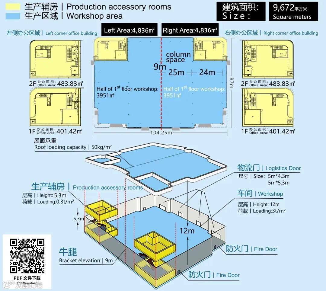 为满足未来“黑灯工厂”的需求,平谦在载体上做了进一步的提升。新一代单层厂房牛腿高度为9米,净高12米,可满足“工业4.0”时代高端制造企业的生产经营需求。