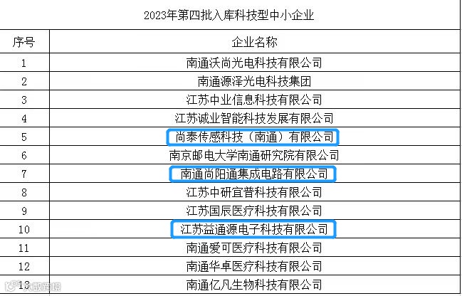 近日,江苏省科学技术厅公布了2023年第四批入库科技型中小企业,其中,园区内企业尚泰传感科技(南通)有限公司、南通尚阳通集成电路有限公司、江苏益通源电子科技有限公司成功上榜。