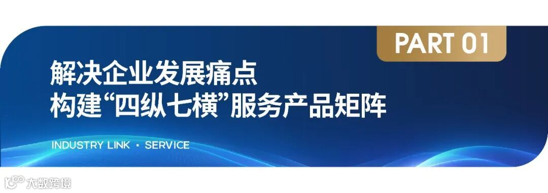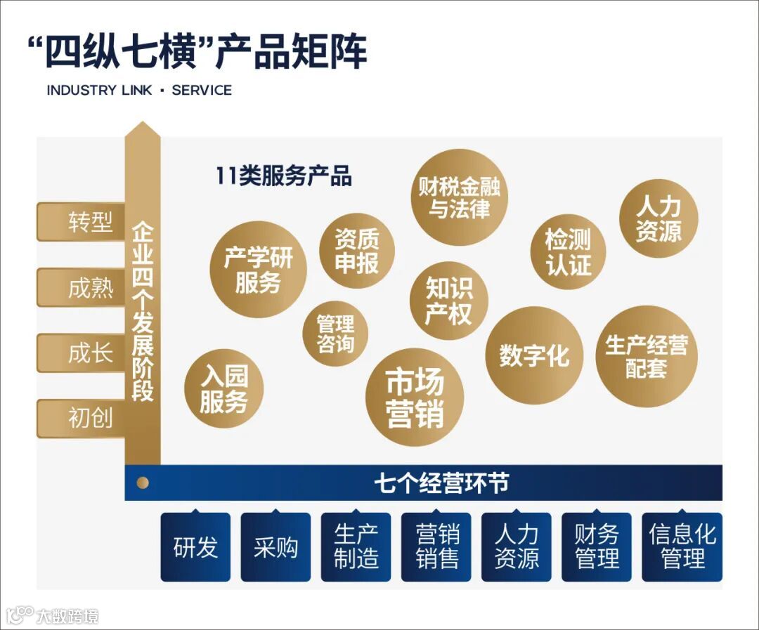 通过“四纵七横”产品矩阵体系打造,因大产服的集成化服务涵盖11大类、100+服务产品,300+合作伙伴。