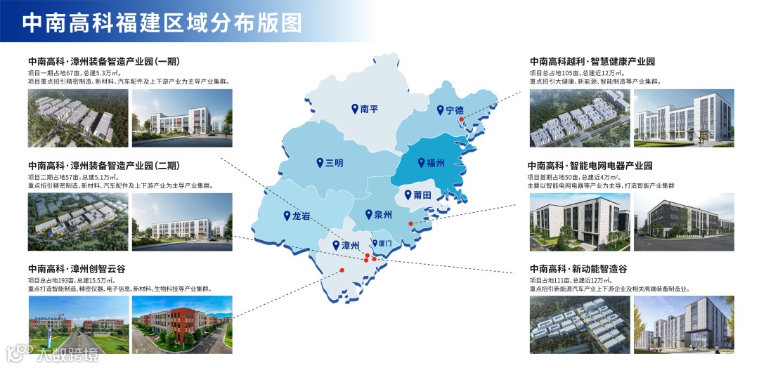 中南高科浙闽公司是中南高科产业集团部署海西区域的重要板块。目前福建片区已进驻漳州、泉州、宁德等核心城市,已落地开发6个项目:中南高科·漳州创智云谷、中南高科·漳州装备智造产业园(一期)、中南高科·漳州装备智造产业园(二期)、中南高科·智能电网电器产业园、中南高科越利·福安智慧健康产业园、中南高科·新动能智造谷。未来,中南高科浙闽公司将加快步伐,持续深耕福建片区,为福建为企业带来更多更好的优质标杆产业园区。