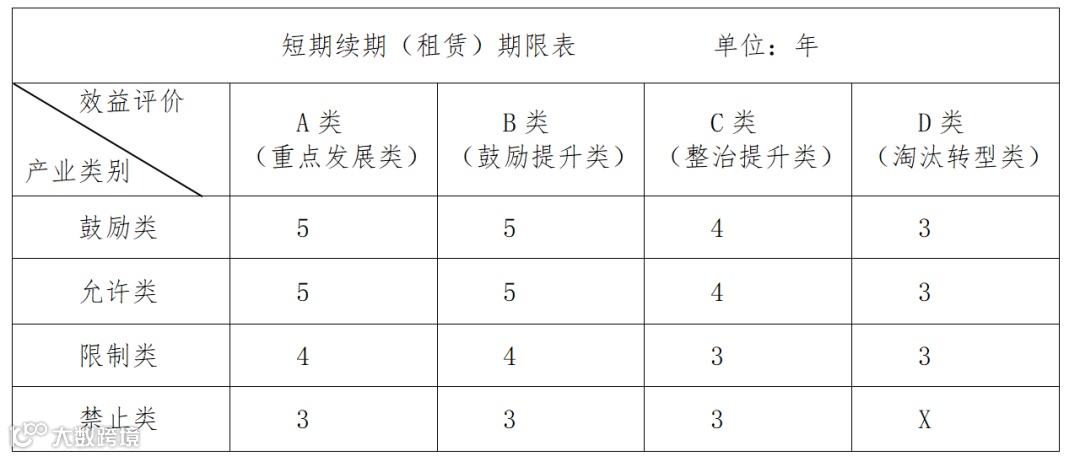 以杭州钱塘新区为例,根据《杭州钱塘新区工业用地使用权出让续期办法》,钱塘区将工业用地使用权续期分为准予续期、短期续期、不予续期三种类型。企业的工业用地需要续期时,将被考察产业导向、最新的亩产效益情况、是否符合规划等要素,综合判定续期类型和续期年限。