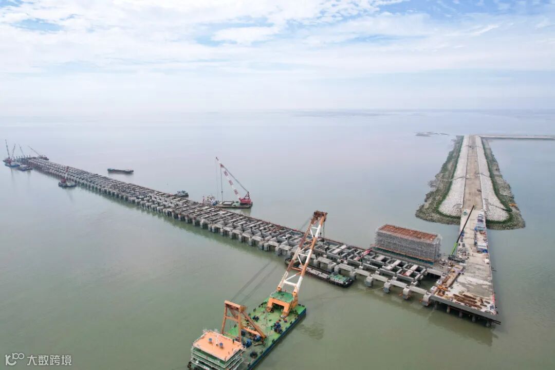 7月5日,记者时隔半年故地重访,目睹变化倍感振奋。进入港口工区,沿着引桥前行,导航地图显示已置身大海。记者清楚记得,去年底,引堤三四公里处的道闸就是“终点”,远处只见几根桩基隐约露出水面。现在,过了道闸继续前行,再往大海深处延伸约2公里,一片开阔区域映入眼帘。10多米高的港区用房已经封顶,泊位立桩一字排开,环抱式港湾张开双臂拥抱蔚蓝……这里,就是独具“公铁水、江海河”集疏运优势的江苏新出海口主港区所在地。