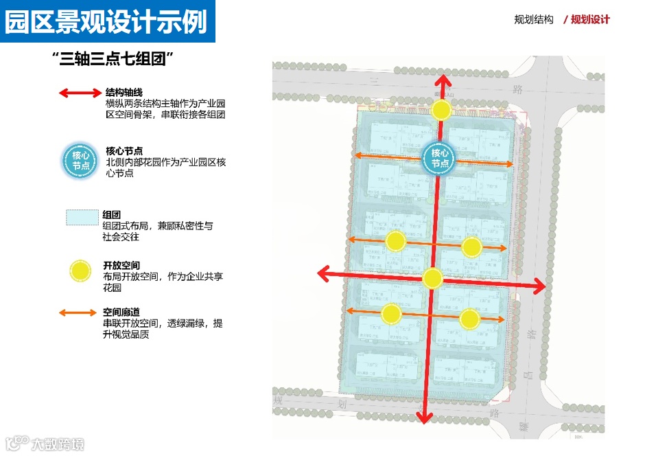 园区内部结合丰富的植物设计、休闲空间设计,打造生态、疏朗的核心绿地景观,打造舒适的生产、生活、办公空间。