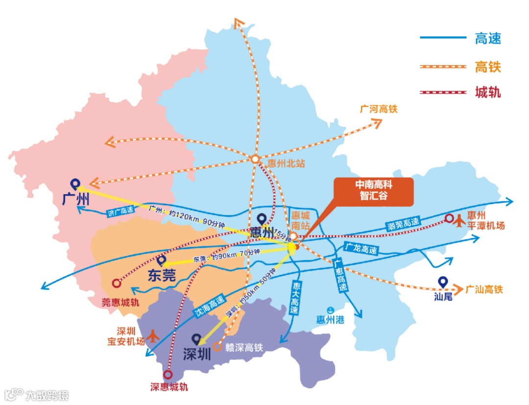 作为惠州打造万亿级产业集群主要阵地,中南高科·智汇谷可谓占尽地利,高速、机场、港口、高铁近在咫尺,无论物流运输还是商务出行都非常高效便捷,企业发展快人一步。