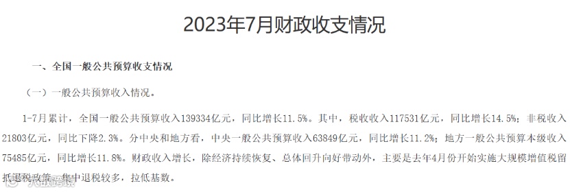 1-7月,全国一般公共预算收入139334亿元。其中,税收收入117531亿元,同比增长14.5%;非税收入21803亿元,同比下降2.3%。