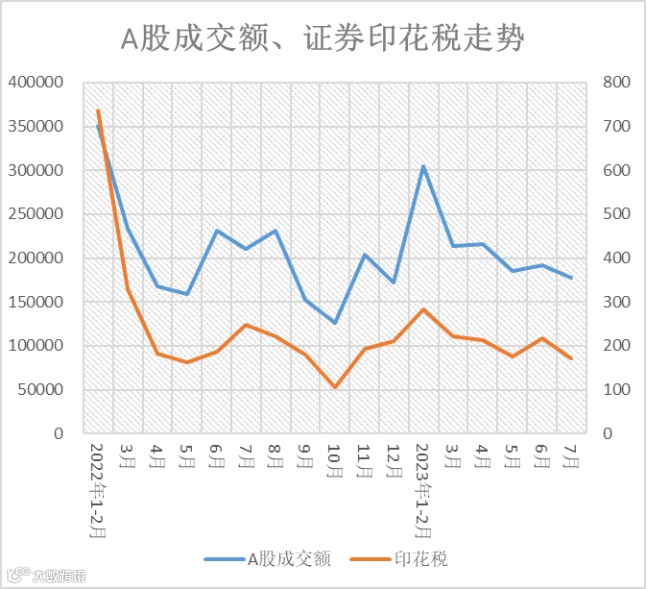 (2022年1月-2023年7月A股成交金额与证券交易印花税月度走势。根据财政部数据和东方财富choice数据统计 单位:亿元)