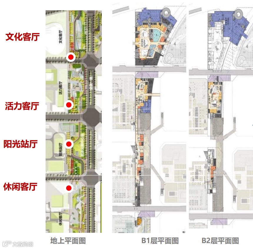 总体开发地下二层,局部为地下三层,包括地铁16号线能源中心站及地下商业中心、下沉式休闲广场,同时布局“文化客厅、活力客厅、阳光站厅、休闲客厅”四大功能空间,建成后将成为新中心新轴线上首个打开式的城市绿廊综合体。