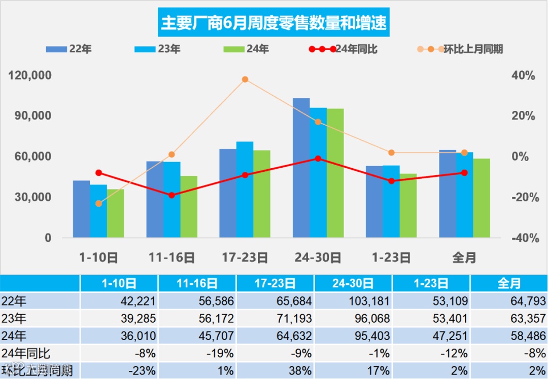 7月4日,乘联会数据显示,初步统计6月1-30日,乘用车市场零售175.5万辆,同比下降8%,环比增长2%,今年以来累计零售982.8万辆,同比增长3%;6月1-30日,全国乘用车厂商批发213.0万辆,同比下降5%,环比增长4%,今年以来累计批发1,171.4万辆,同比增长6%。