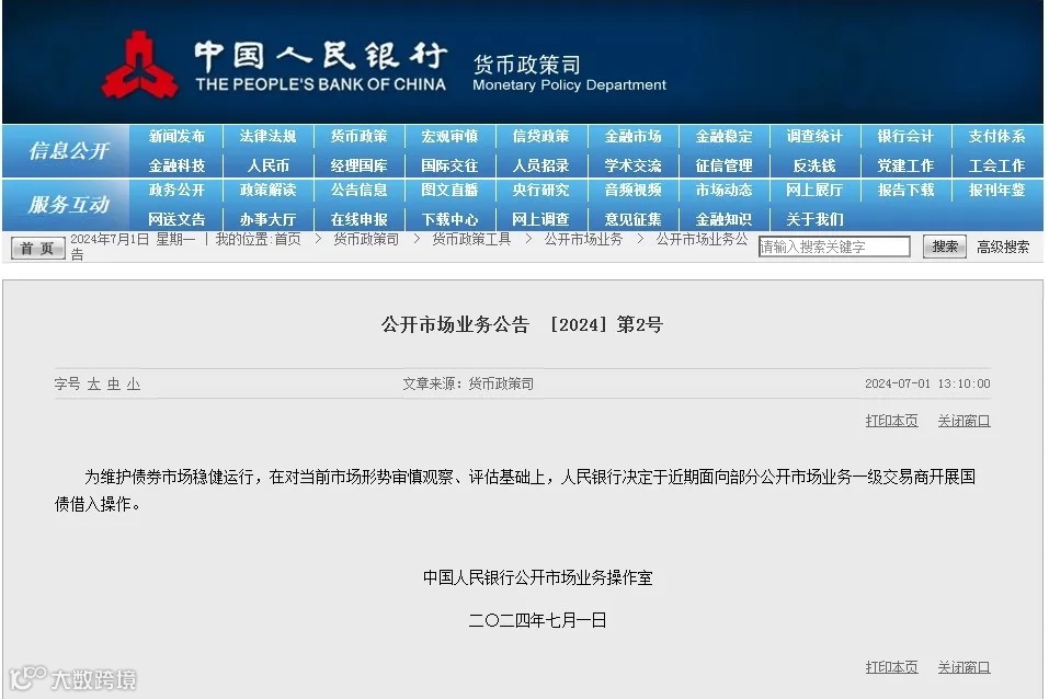 中国人民银行7月1日发布公告称,为维护债券市场稳健运行,在对当前市场形势审慎观察、评估基础上,决定于近期面向部分公开市场业务一级交易商开展国债借入操作。