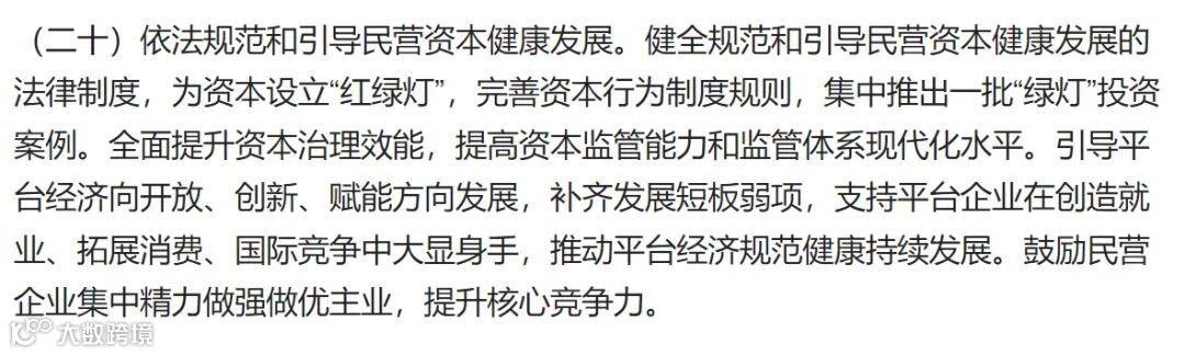 《意见》中明确表示:健全规范和引导民营资本健康发展的法律制度,为资本设立“红绿灯”,完善资本行为制度规则,集中推出一批“绿灯”投资案例。