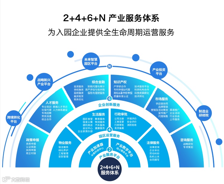 为入园企业提供“2+4+6+N”全生命周期产业服务,打造全产业链的服务生态圈。以2大产业服务平台为载体,4大园区运营服务为基础,6大企业创新服务为特色,联动N个特色服务平台,为企业提供标准化和定制化服务,助力企业发展。