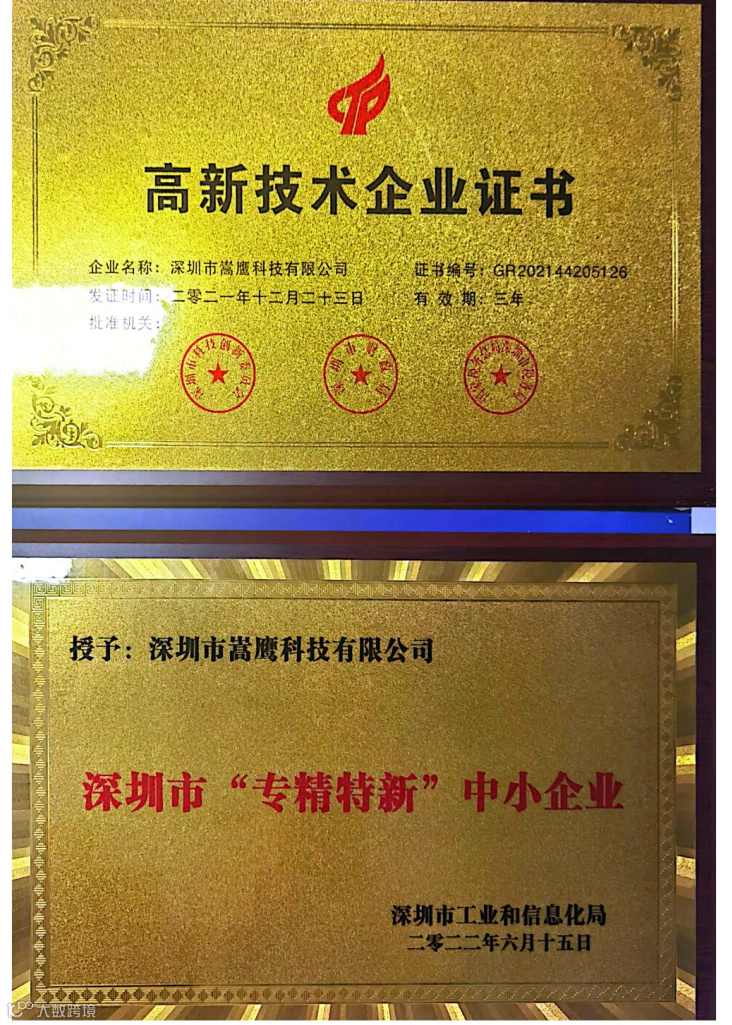 2018年,深圳市第一批获国家高新技术企业认定名单,深圳市嵩鹰科技有限公司成功上榜。2022年,深圳市工业与信息化局公布新一批市专精特新企业,深圳市嵩鹰科技有限公司再次榜上有名,连续获得“国家高新技术企业”与“专精特新”企业称号,不仅体现了嵩鹰科技的快速成长,也对嵩鹰科技多年深耕电源主业、科研创新的认可。