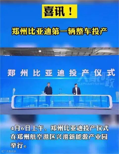 4月6日,郑州比亚迪举行投产仪式,省长王凯出席并宣布项目投产,与比亚迪集团董事长兼总裁王传福共同启动首车下线。