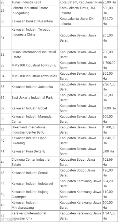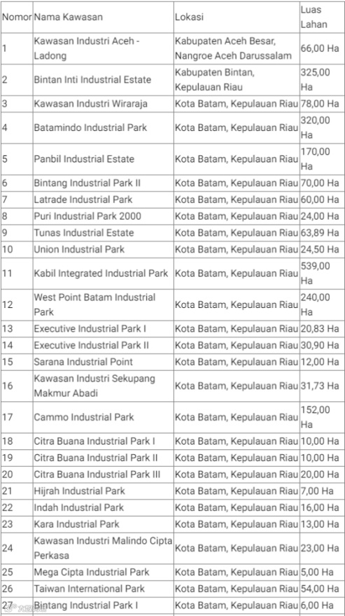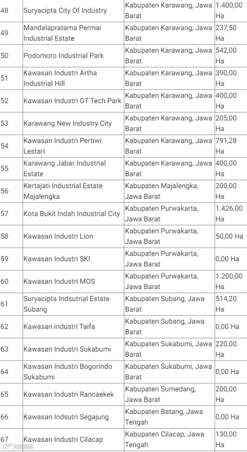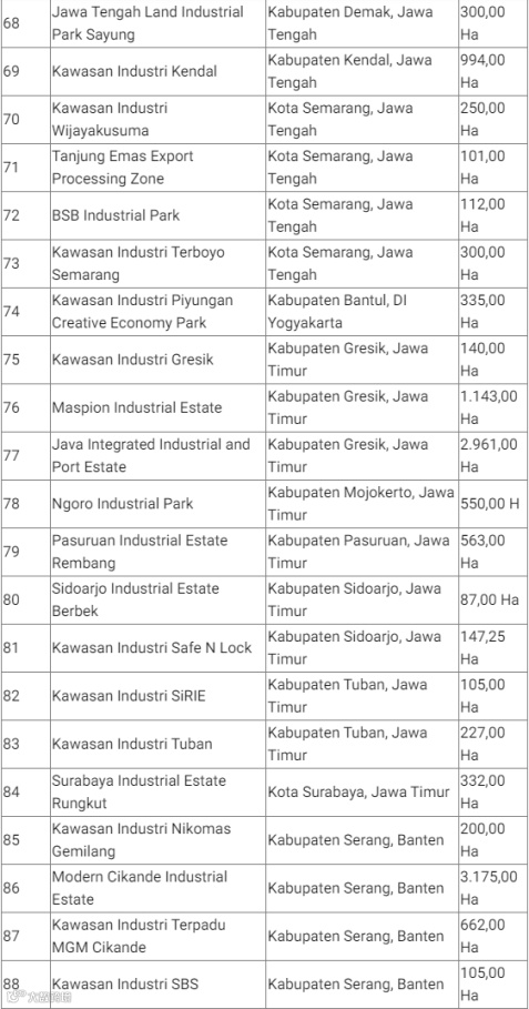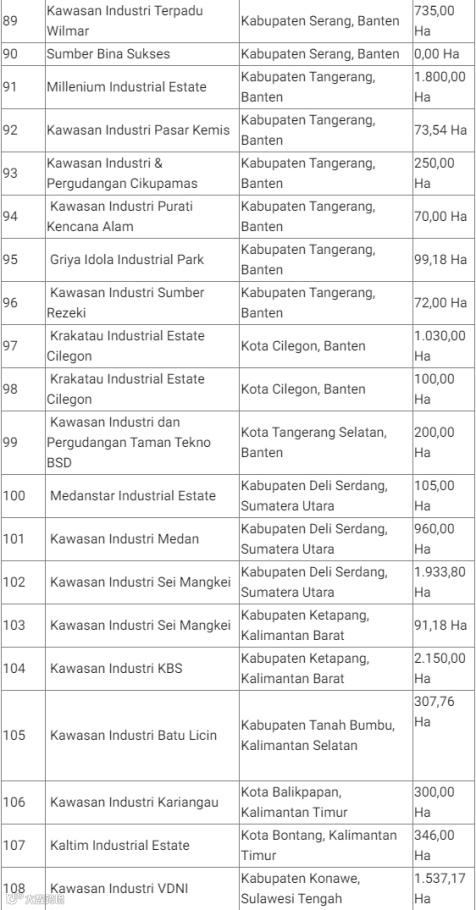 印尼有许多工业区,工业区是加工工业活动集中、具备基础设施及其他配套设施的区域,这些设施由拥有工业区营业许可证的工业区公司提供和管理。工业区通常配有工厂设备、研究、实验室、办公楼和银行等设施组合。除此之外,工业区往往还配有社会设施和公共设施,例如办公室、住房、学校、礼拜场所、开放空间等。工业区是政府的集中区域之一,因为这些区域可以提高效率并简化基础设施(道路、港口)的提供,提供就业机会并吸引投资。与地缘经济、地缘政治或地缘战略方面具有潜在优势的地区进行综合基础设施开发。另一方面,额外的就业机会将增加人们的收入,从而对增加该地区的经济收入产生影响。工业区还将提高位于工业区的企业的生产力,从而创造附加值。以下为印尼全国122个工业区的名称、地址与面积: