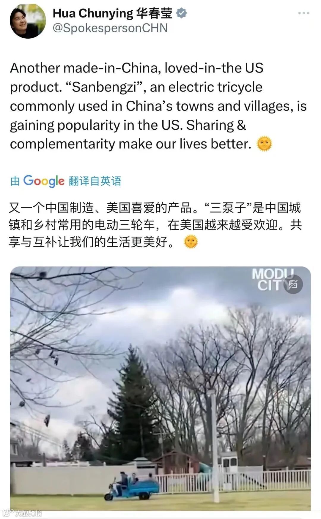 中国外交部部长助理华春莹在社交平台上表扬了一种中国制造的产品——三轮电动车,它在美国市场获得了极高的人气。华春莹表示:“又一个中国制造、美国喜爱的产品。”三轮电动车,俗称“三蹦子”,因其载货量大、敞篷设计和新能源特性,在美国广袤的平原地区尤为适用。