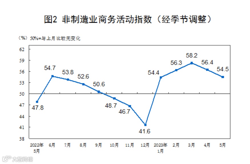 赵庆河表示,5月份,非制造业商务活动指数为54.5%,低于上月1.9个百分点,今年以来始终保持在54.0%以上景气区间,非制造业延续恢复性增长。