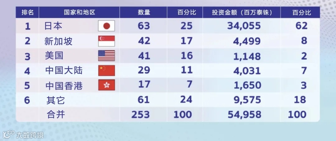 日企凭借63家企业的庞大数量,占据了泰国外商总数的25%。这些企业投资了高达340.55亿泰铢(折合人民币约68.11亿元),涉足广告、电子元器件质量检测、金属镀膜服务、数字内容开发(如动画)及产品生产服务(压铸铝件/汽车件/金属件)等多个领域。