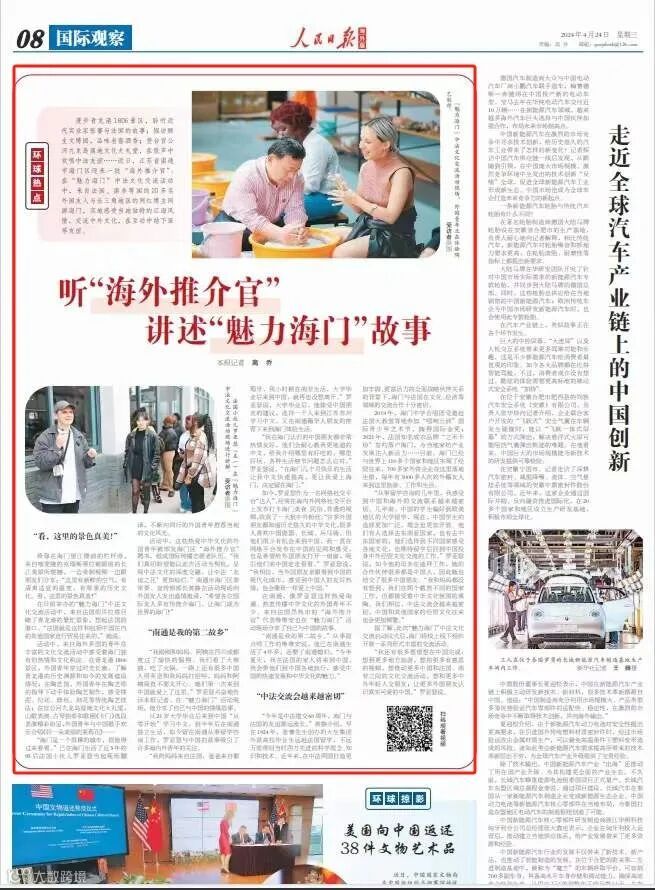4月24日《人民日报海外版》第8版,以《听“海外推介官”讲述“魅力海门”故事》为题,介绍了近日我区迎来一批“海外推介官”。在“魅力海门”中法文化交流活动中,来自法国、南非等国的20多名外国友人与长三角地区的网红博主同游海门,实地感受本地独特的江海风情,交流中外文化,在互动中结下深厚友谊。
