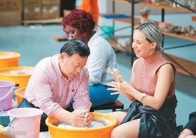“魅力海门”中法文化交流活动现场,外国青年正在体验陶艺制作。