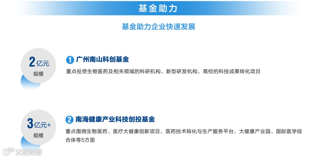 项目拥有广州南山科创基金、南海健康产业科技创投基金两大基金加持,助力企业快速发展;同时享有市、区、镇三级针对生物医药产业发展的扶持政策;