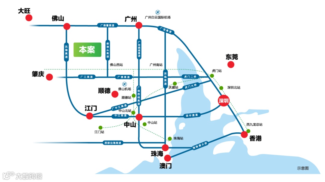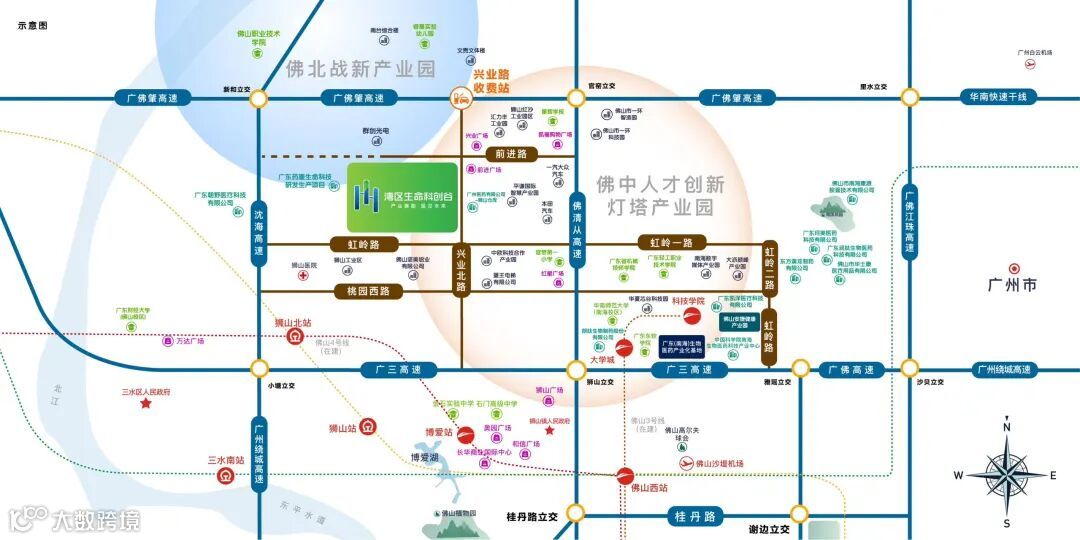 3高速环绕(广佛肇、广州绕城、佛清从),5分钟直上兴业收费站,1小时畅通湾区核心城市;3轨道交通(狮山北站、狮山站、佛山西站);2机场(佛山机场、广州白云国际机场)