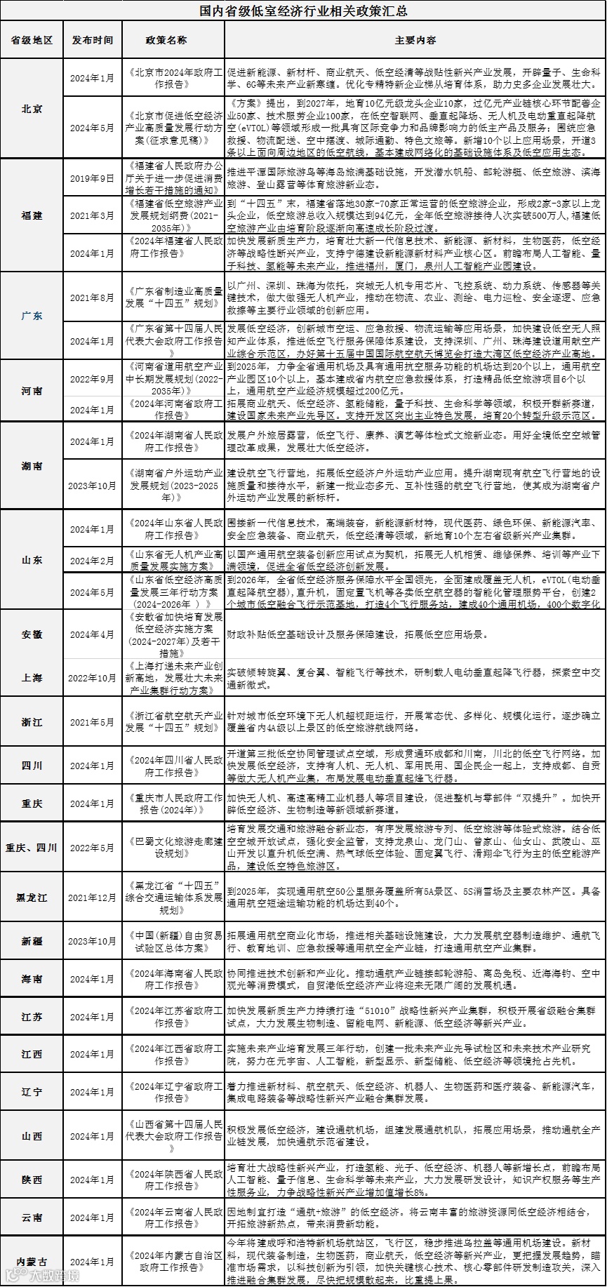为积极响应号召,各地政府根据当地实际情况制定了相应的政策规划以推动低空经济的发展。全国多个省级地区颁布相关政策,并将低空经济写入了政府工作报告,包括北京、广东、福建、河南、湖南、山东、安徽、上海、浙江、四川、重庆、黑龙江、新疆、海南、江苏、江西、辽宁、山西、陕西、云南、内蒙古等地区。具体列表如下: