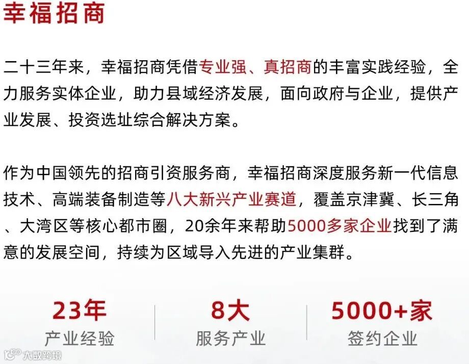 幸福招商·面向全国广大县域经济源地接受招商引资服务委托, 服务制造业企业在全国各开发区落地并享受相关招商引资政策,厂房土地资源丰富、政策给力,已累计签约入园企业 3000余家,其中500强企业 33家,上市公司49家,国家高新技术企业 560余家,知名品牌 420余家,专精特新企业20家,外资企业 34家。