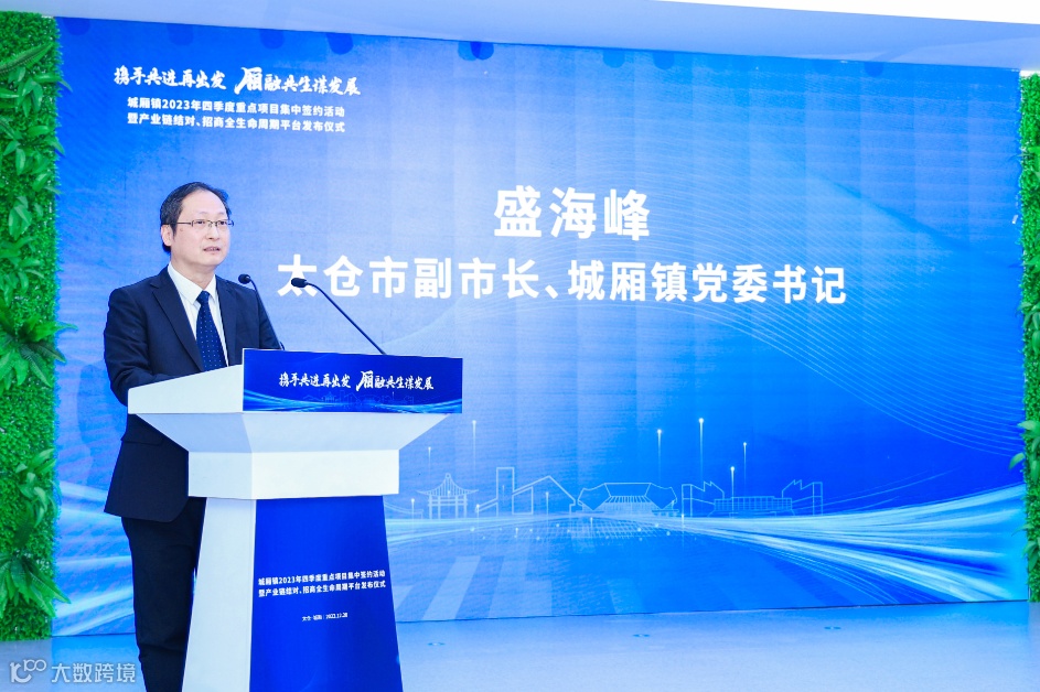 盛海峰在致辞中表示:今年以来,城厢镇抢抓长三角一体化发展、融入上海桥头堡等重大机遇,锚定“善美城厢 幸福家园”目标,积极围绕服务有效市场,推动政企“双向奔赴”共谋发展;加快培育链主企业,推动重点产业延链补链强链;发布展示投资推介最佳窗口,推动创新创业生态环境优化。经济指标回稳向好,高质量发展扎实推进,位列全国综合实力千强镇第65位、进位3位。接下来,城厢镇将健全优化产业链供应链机制,全力惠企纾困、助推发展壮大,打造“亲商、安商、富商”的营商环境。同时希望企业对标行业龙头,坚定发展信心,推动签约项目早开工、开工项目早建成、建成项目早投产,为城厢稳定经济增长积蓄强大动能。也真诚邀请和欢迎优秀企业家投资城厢、深耕城厢,携手筑美好,一起向未来。