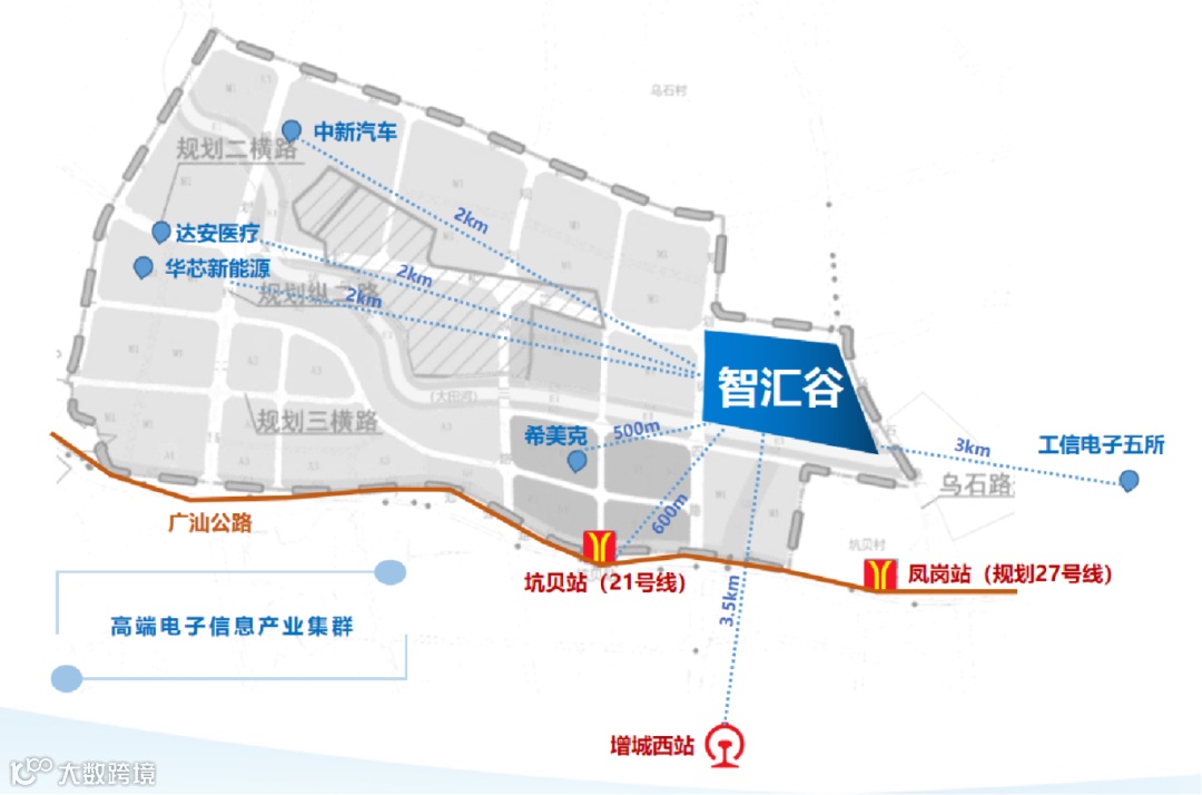 项目距离广州地铁21号线坑贝站约600米,离增城西站约3.5公里,与广州科教城相距约500米。周边华芯新能源、希美克、中新汽车、工信部电子五所等企业环绕,“高校+高企”为中南高科智汇谷·增城带来了“人才、产业资源”的输送,也为增城产业高质量发展提供坚实“支撑”。