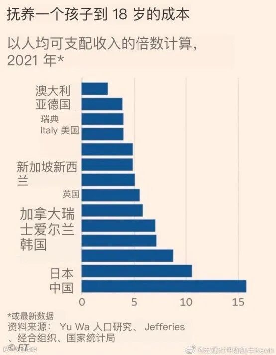 不过,有人制作了一个以“抚养一个孩子到18岁的成本和人均可支配收入”为标本。来对比几个大国的养娃成本。