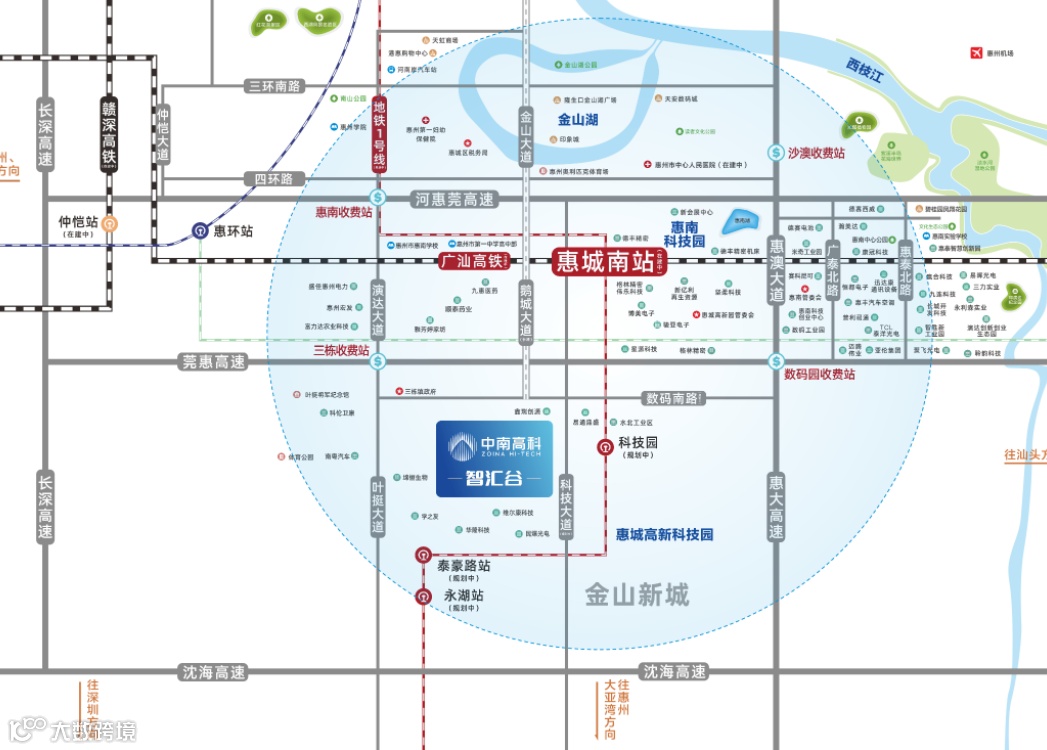 中南高科·智汇谷距离甬莞高速入口约1.25公里,距离甬莞高速出口约1.26公里,距离惠大高速出口约1.38公里,距离惠大高速入口约1.38公里。此外,园区距离惠州市区和惠州市其他重要地区也非常便利,交通十分便捷。