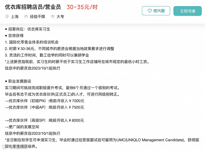 BOSS直聘上一则优衣库上海门店实习生招聘信息显示,实习生时薪为30-36元,若转为正式员工,初级(PN)、中级(AP)、高级(SP)员工税前月收入分别为7000元、7500元和8000元,以上薪资均从10月1日起执行。