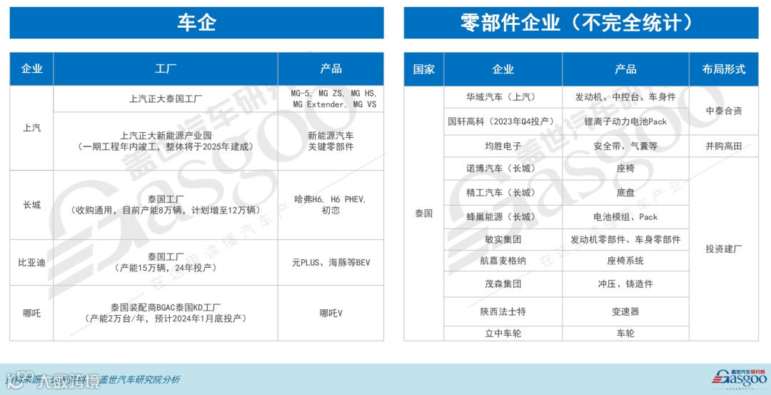 据盖世汽车不完全统计,截至目前,已有10余家中国整车及零部件企业宣布或已经在泰国建厂,预估总投资额高达数百亿元人民币。其中,长城汽车收购通用汽车泰国工厂,比亚迪在泰国罗勇府开工建厂,长安汽车、哪吒汽车也已经在泰国建设新能源车生产厂,广汽埃安于今年6月宣布在泰国开展本地化生产;华域汽车,国轩高科,均胜电子,蜂巢能源与敏实集团等零部件企业也以不同形式出海泰国。